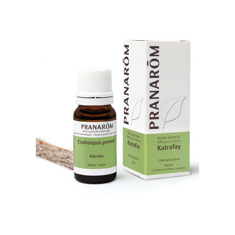 PRANAROM AE KATRAFAY 10ML BIO, este arbusto de Madagascar proporciona un aceite esencial a partir de su corteza. Su composición bioquímica es muy original por el sesquiterpeno que contiene: ishwarano límpido y de color amarillo claro a anaranjado. Su olor a madera y balsámico es muy agradable.