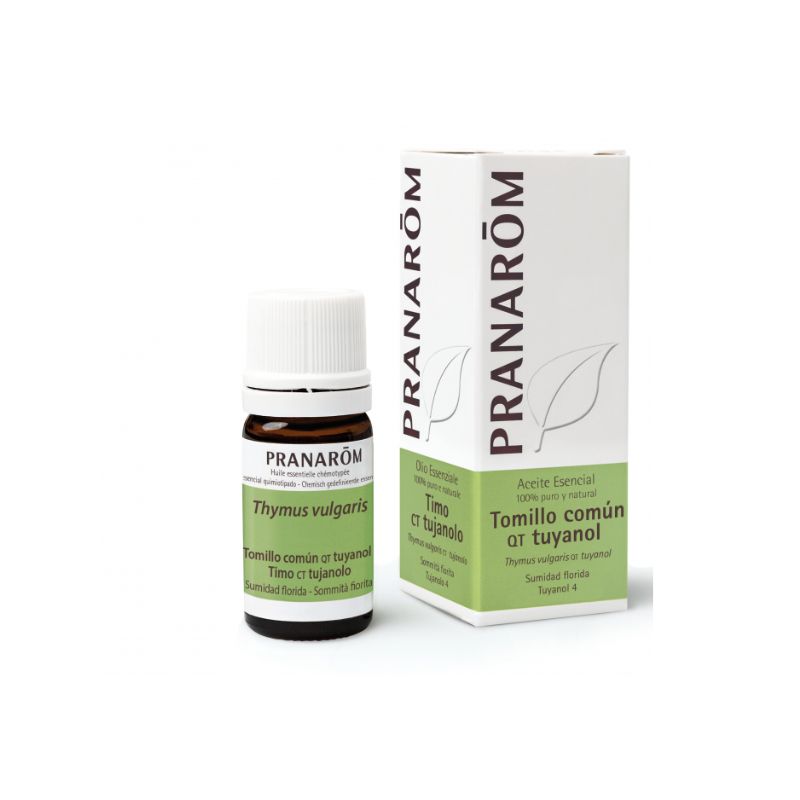 PRANAROM AE TOMILLO COMUN TUYANOL 5ML, posee pequeñas hojas lanceoladas curvadas. El tallo es leñoso y las ramas son ascendentes. Las flores son de un rosa pálido agrupadas en florescencias densas. El tomillo vulgaris qt timol es uno de los 6 quimiotipos de tomillo identificados por Passet, Granger y Vernet. Crece en el sur de Francia (principalmente en Provenza) en suelos calcáreos.